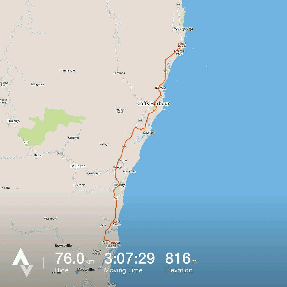 [Looking more closely, I’ve just realised that there is some sort of glitch with the route through Coffs city centre – although it’s correct when I’m logged into my Strava account. All rather frustrating.]