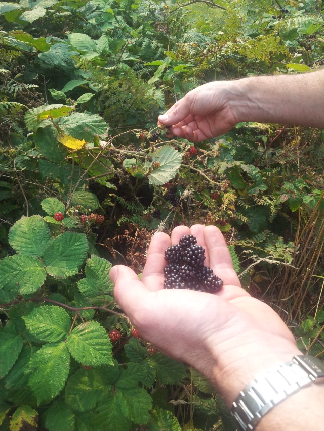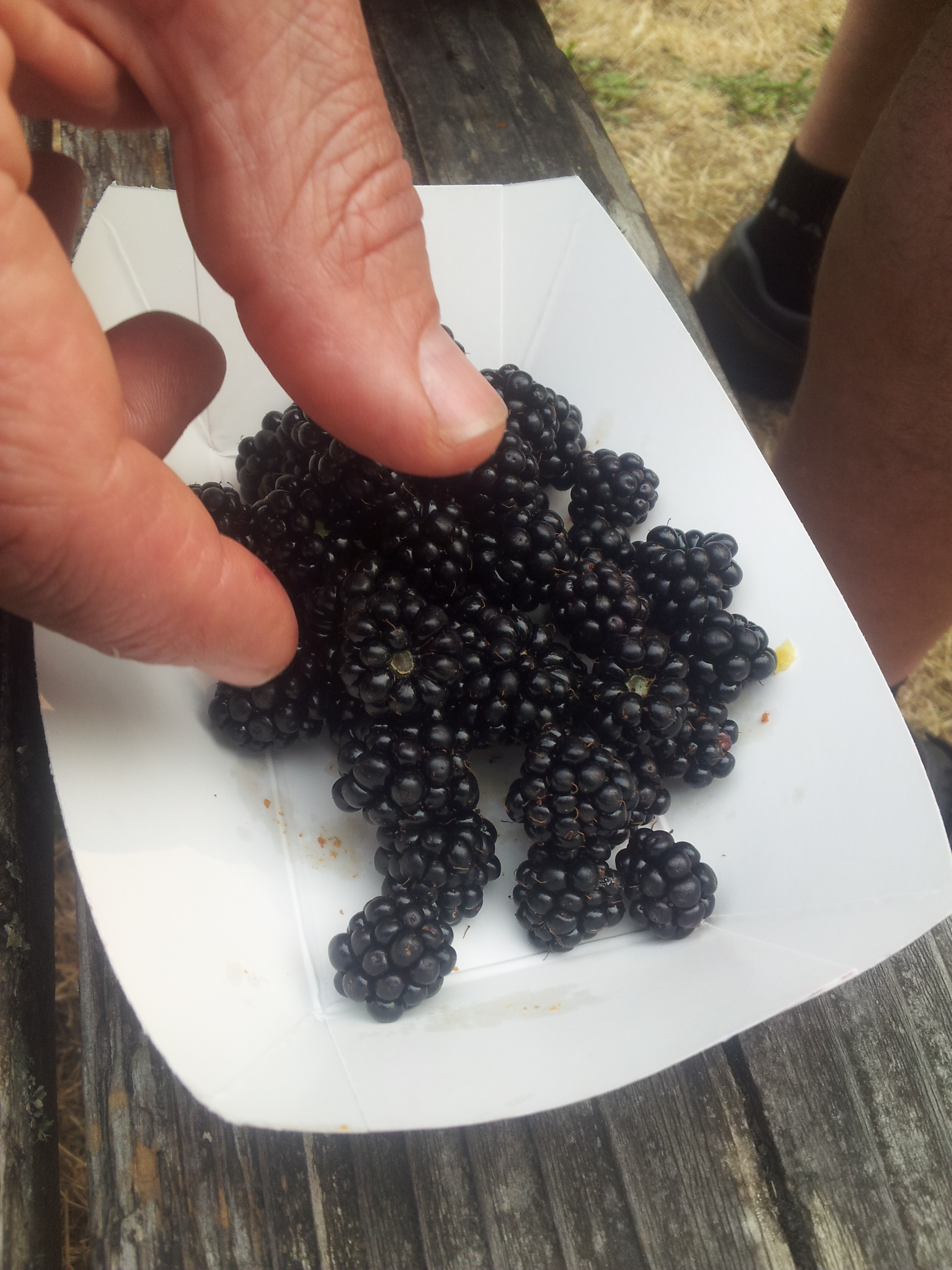 Lunch stop in a little place called Langlois, which claims (on its town-sign) to be ‘world famous’ (but we still don’t know how they pronounce it!)… and to have ‘world famous hot dogs’ in the (what we’d call a) general store.  Never mind that I’d noted there was actually a cafe in Langlois.  We tried the hot dogs. Which were… hot dogs. The only upside to that stop was having blackberries for ‘dessert’.   From day 1 we’ve seen blackberries growing by the side of the road everywhere – and quite a few people stopped picking them.  So Marc went foraging.