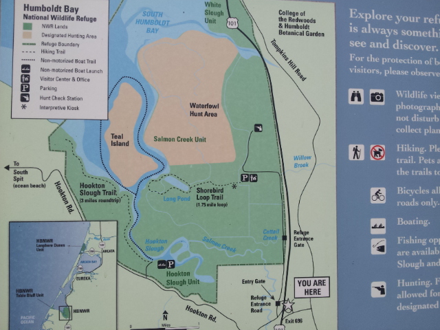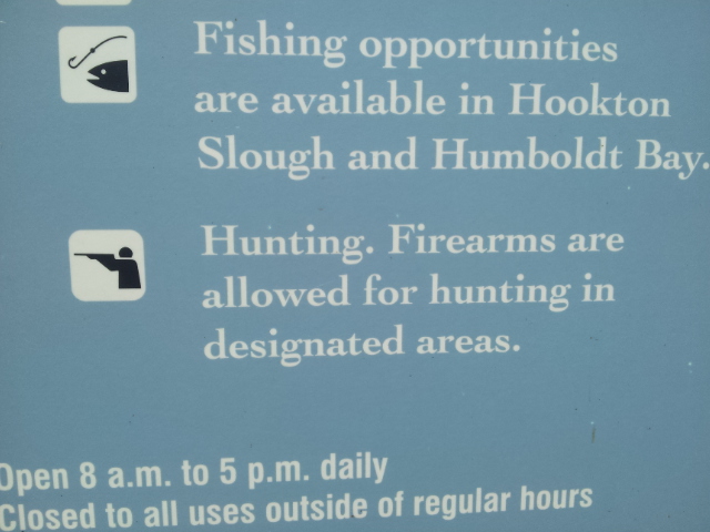 The rest of the ride south of Eureka included yet more variety. A newish bike trail along the water. A few kms of freeway, then off again. (Stopped for a break before a bit of a hill at the entrance to this Wildlife Refuge – and couldn’t help but roll eyes at how it’s a Wildlife Refuge but in a goodly portion of it you can kill the birdlife.