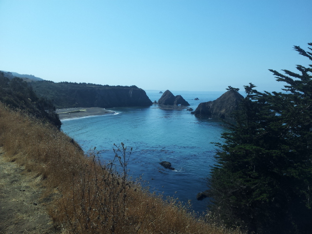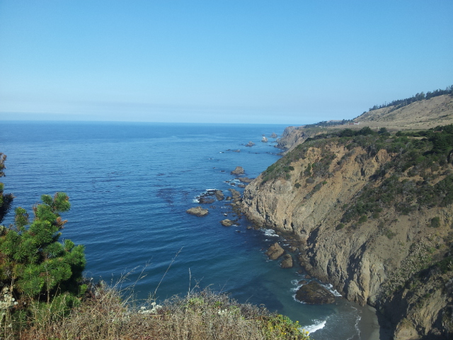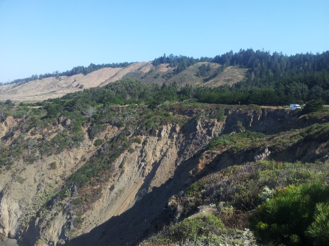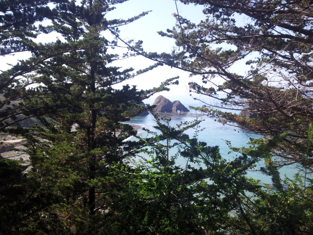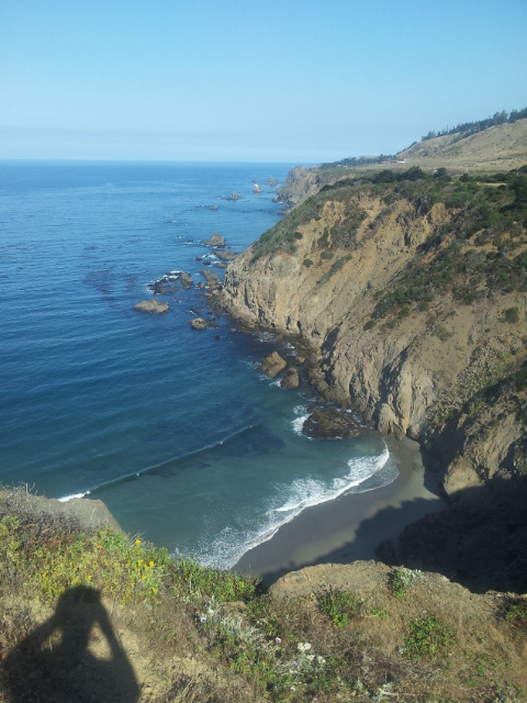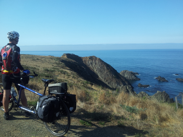 Fast descents into gullies (or ‘gulches’ as they appear to be called here), then a slow climb back up. As it turns out, we actually did today what is apparently the steepest gradient on the whole of the Pacific Coast route. We had heard about it, but couldn’t remember where it was. As we were slugging up these couple of ridiculously steep pinches, I was hoping that this indeed might be That Climb, because I really, really didn’t want to even think about handling anything steeper. Turns out a few people walk it, but Marc Does Not Like To Walk and will pull power out of nowhere to achieve that aim. Also our new tandem is (deliberately) lower geared just for these kind of situations. (At the expense of the bigger ring where we now coast where we would have still been cranking it down a hill on the Santana). I honestly don’t know that I could have done it on my own – not being known for my hill-climbing.
