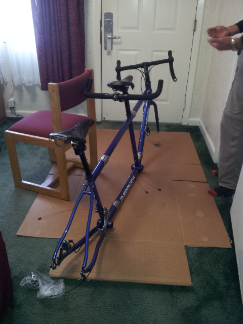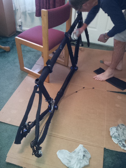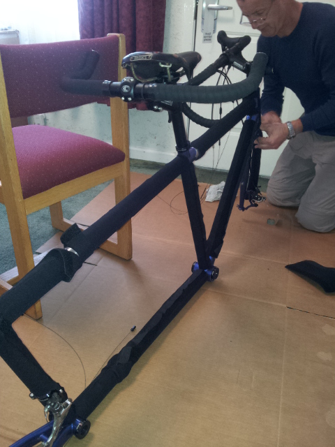 Friday we spent dismantling the bike, which included cutting the padding to size. (Obviously, future packing won’t need that step.)