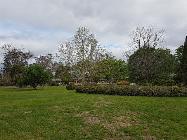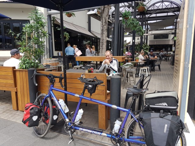 Camden for lunch, after a bike path between Narellan and Camden led us up over a hill and into a new estate instead of back onto the road. We ummed and ahhed, and then decided why not introduce a bit cyclocross into the mix. Through a field, over a creek on planks and old broken pallets, and then through a skate bowl. Even dropped in (or whatever the cool kids call it), to the sounds of Tracey going ‘noooo, you’re not going d…. woah!’. [Narrator: ‘He did’] More hilariously the two kids standing up on the high side with their scooters didn’t even blink – completely ignored a loaded tandem with two old farts riding through their skate bowl.