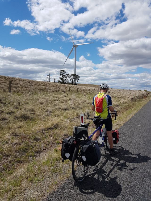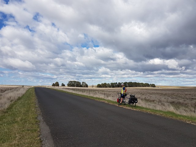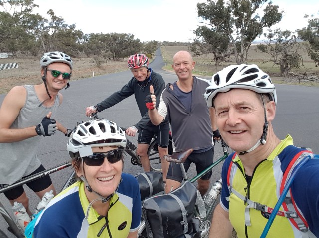 So as we approached our left turn off Maffra Rd onto Snowy River Way we saw three cycle tourers coming along from the right (from the direction of Dalgety). We stopped to chat at the corner. They were Will, Mike and (we think!) Paul, from the UK. They were riding Melbourne to Sydney, had left Melbourne the same day we left Sydney, but our respective routes only overlapped for a few kilometres, so what are the chances of running into each other like that?! They were headed to the coast via Nimmitabel. Great to swap touring stories, and hope all continues well for their travels!