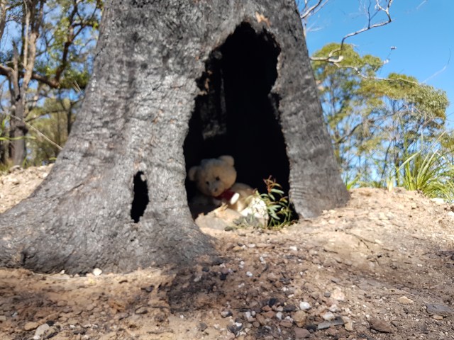 There are worse places to have a mechanical issue. Worse weather too (like what tomorrow is forecast to be 🌧️🌦️🌧️) Setting off again. We could see bits that had burnt in the fires last year. Saw one house that must have been surrounded by flames but escaped ok. Spotted some interesting local wildlife. Unsure of the species, but quite possibly a drop bear. 😁 Fortunately he didn’t see me.🎶 There’s a bear in there…. 🎶