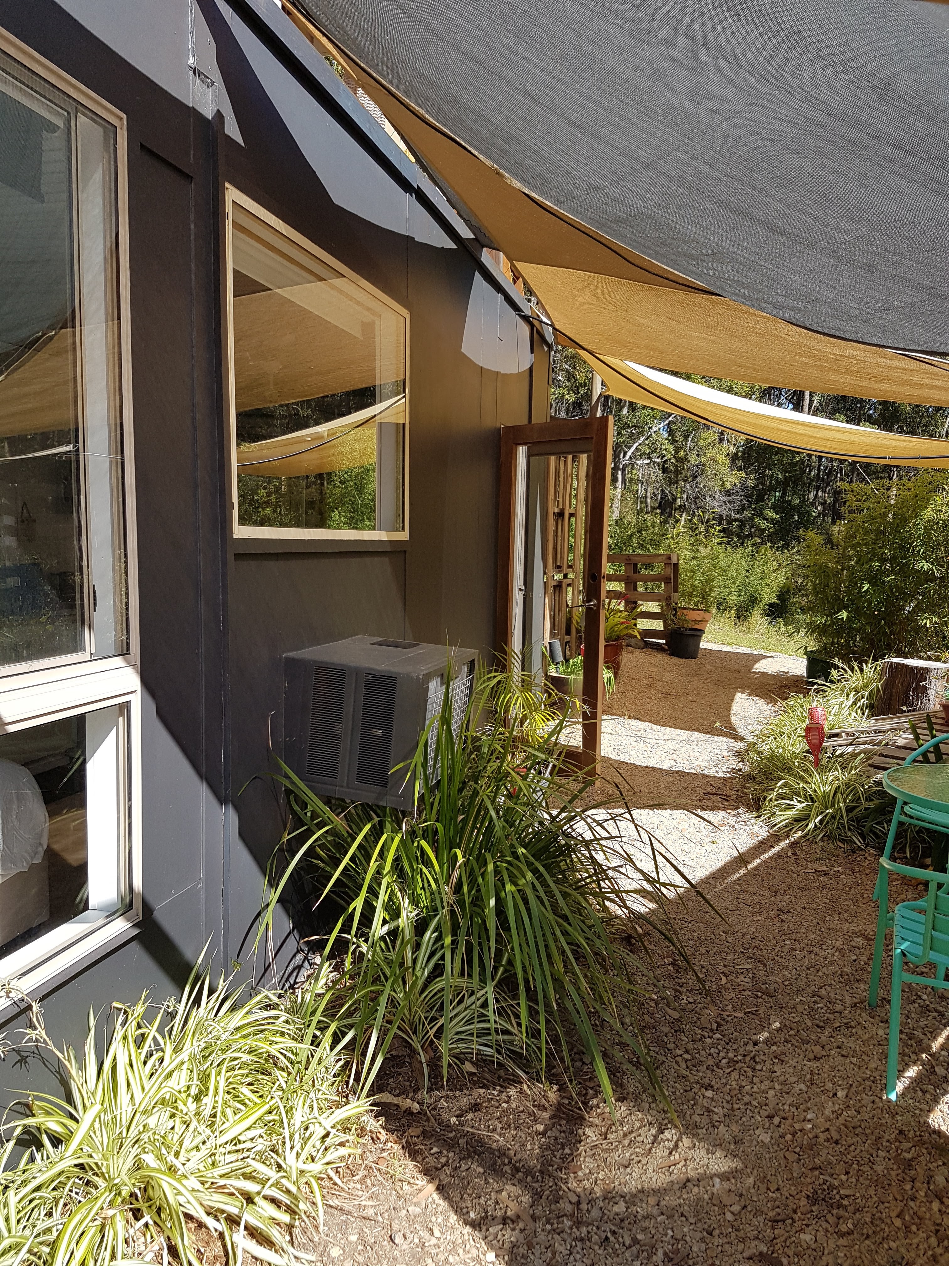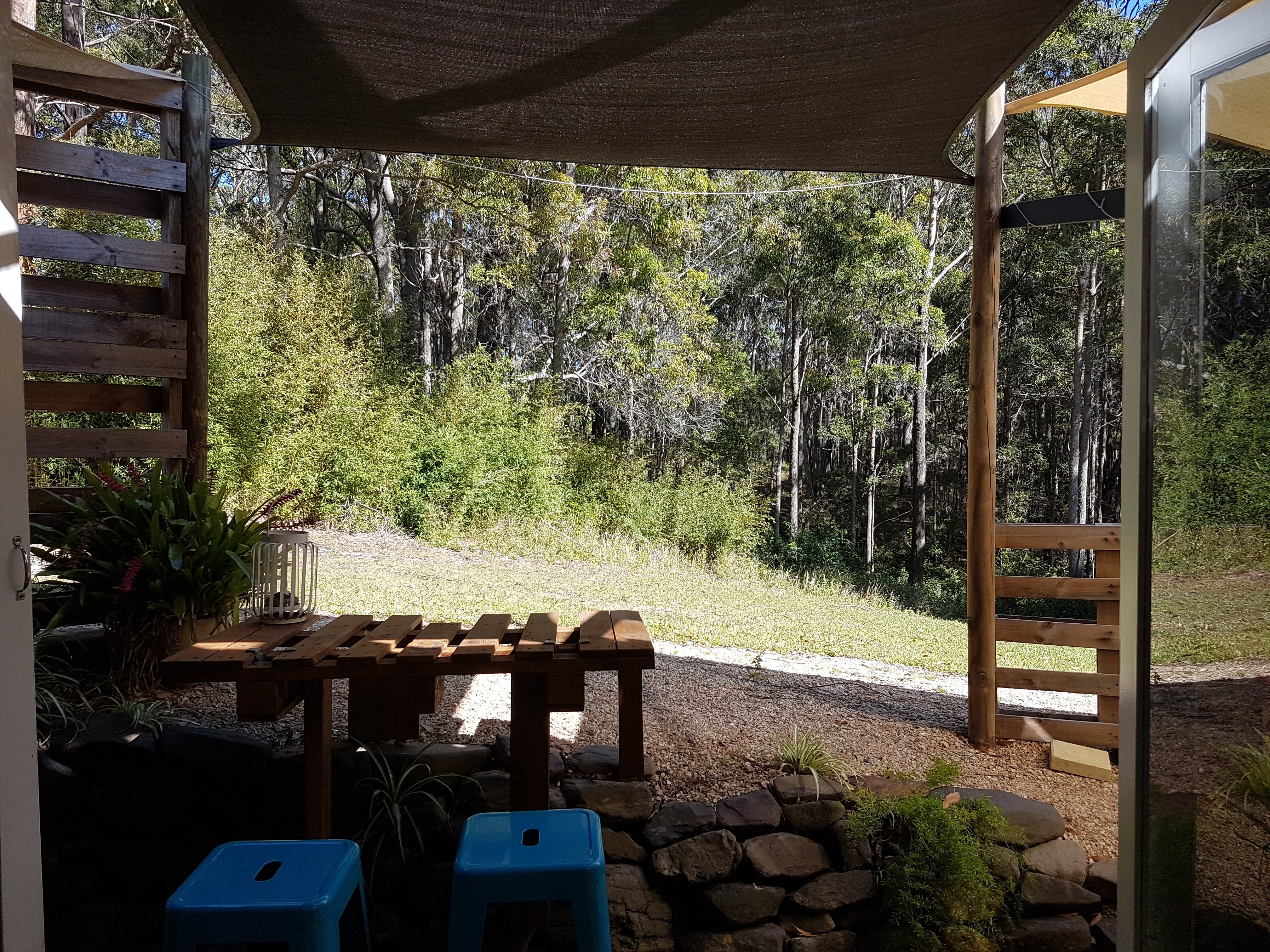 So the accommodation last night was pretty nice. It was more or less a B&B that I’d found on booking.com, at the back of a house, and overlooking the bush. It was well-provisioned with coffee, tea, and breakfast cereal (including a generous plate of fruit). If it wasn’t for the too-high pillow, and the neighbouring cabin smokers, it would have been perfect (although Marc was interested in the regulations with respect to the eclectic collection of recycled doors, windows, and the bathroom ventilation.) Would stay there again though.