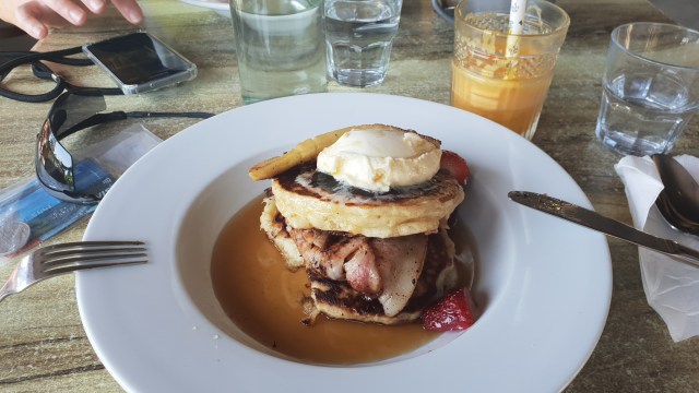 We had some fun and games with impatient drivers through a few more roundabouts on Giinagay Way, and we opted for a stop the cafe at Valla again. Despite the good brekkie at the B&B only 9km back, we were lured by the hotcakes …
