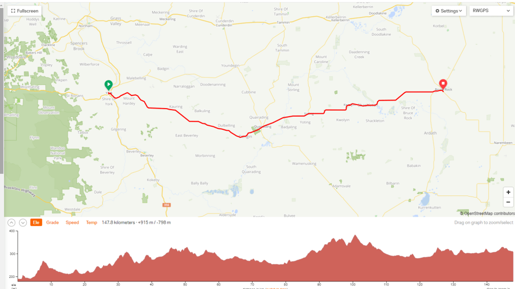 By the time we reached Quairading at about 68km, the day was well and truly warming up. The first place we came upon was the servo, so we bought a drink, and (vague memory) some kind of fried food that upon eating it you really wished you hadn’t. We sat outside there trying to make contact with accommodation options in Bruce Rock – with no success – getting cranky in the heat. I was wishing I’d booked in advance, despite it supposedly not being the ‘vibe’ of what you should be doing. And we had wasted time by stopping at the servo first. We then went one block further on to a café for more substantial food – aka lunch. Then across the road to the town hall for the loo (again), and to fill up on water. I remember Marc getting antsy about how long we were taking – and, checking back on rwgps, it looks like we were there for an hour and a half, so, yes, too long really. We still had almost 80km to go – nothing compared to what the guys ahead were doing, but already exceeding our previous ‘touring’ limits.