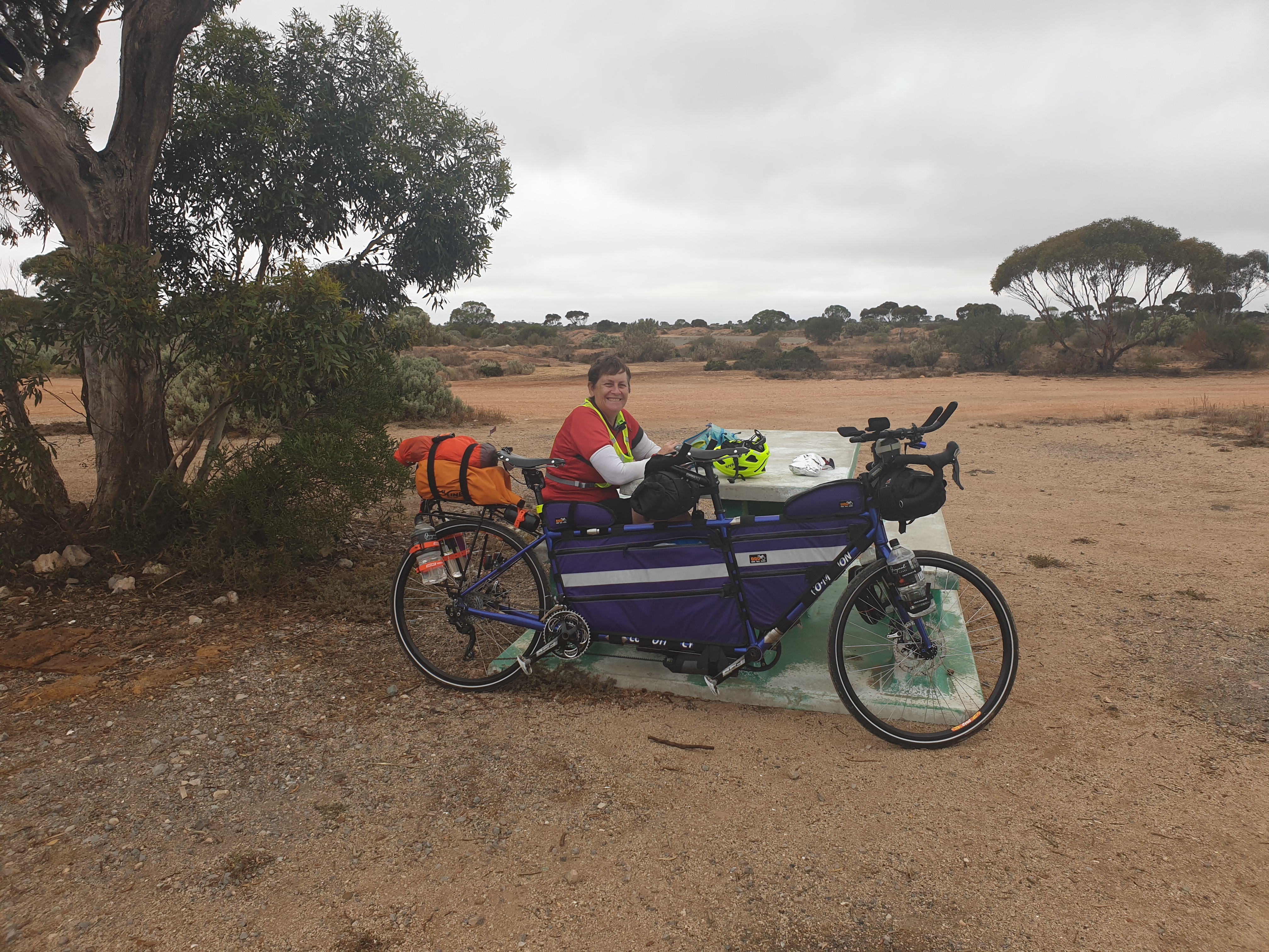 Look, there’s not a lot else to say. Just an all-day slug. I was getting more used to using the radio, and settling on what to say (“Eastbound, eastbound, we’re a cyclist up ahead, do you copy?” – and then go from there based on the response. Sometimes you’d get a “Yep, gotcha, no worries.” Sometimes you’d get nothing and so I’d just throw out a “We’re on the shoulder, any room you can give us would be appreciated.” And then a “Thank you! Have a good day!” if they did give us space. If there was oncoming traffic, it was then up to Marc to figure out our timing (I was pretty bad at that)… and if necessary we’d bail. (“Oncoming, we’re getting off.”) In places, the drop-off from the bitumen to the dirt was a bit severe, so for the tandem Captain, planning ahead was crucial. It did freak me out a bit. (A lot.)