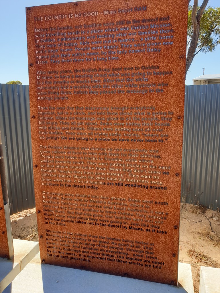 Yalata Aboriginal community (and caravan park) at around 90km was closed due to covid, but we stopped for a rest at a shelter and table right near the road. This memorial sign is hard to read, but it’s worth zooming in (plus googling) to read about the shameful history of Maralinga atomic bomb testing and the displacement of the Aboriginal people of those lands.