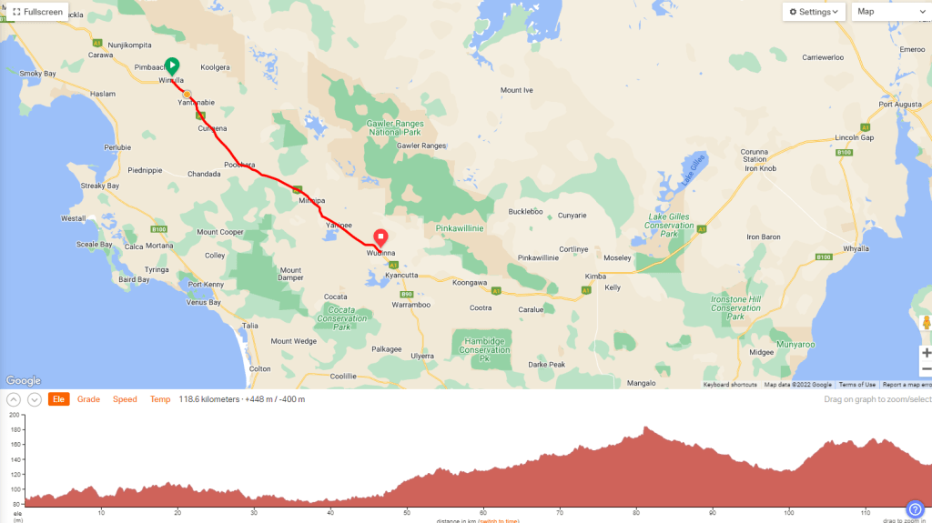 A 38km leg with a brief stop to take some photos. Good shoulder. The day had warmed up in the time we’d faffed around in Poochera – it was around 28 degrees when we rolled into Wudinna and checked into the motel at the back of the pub.