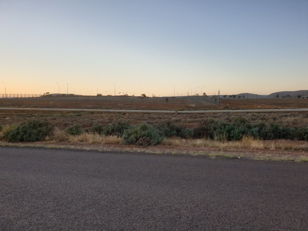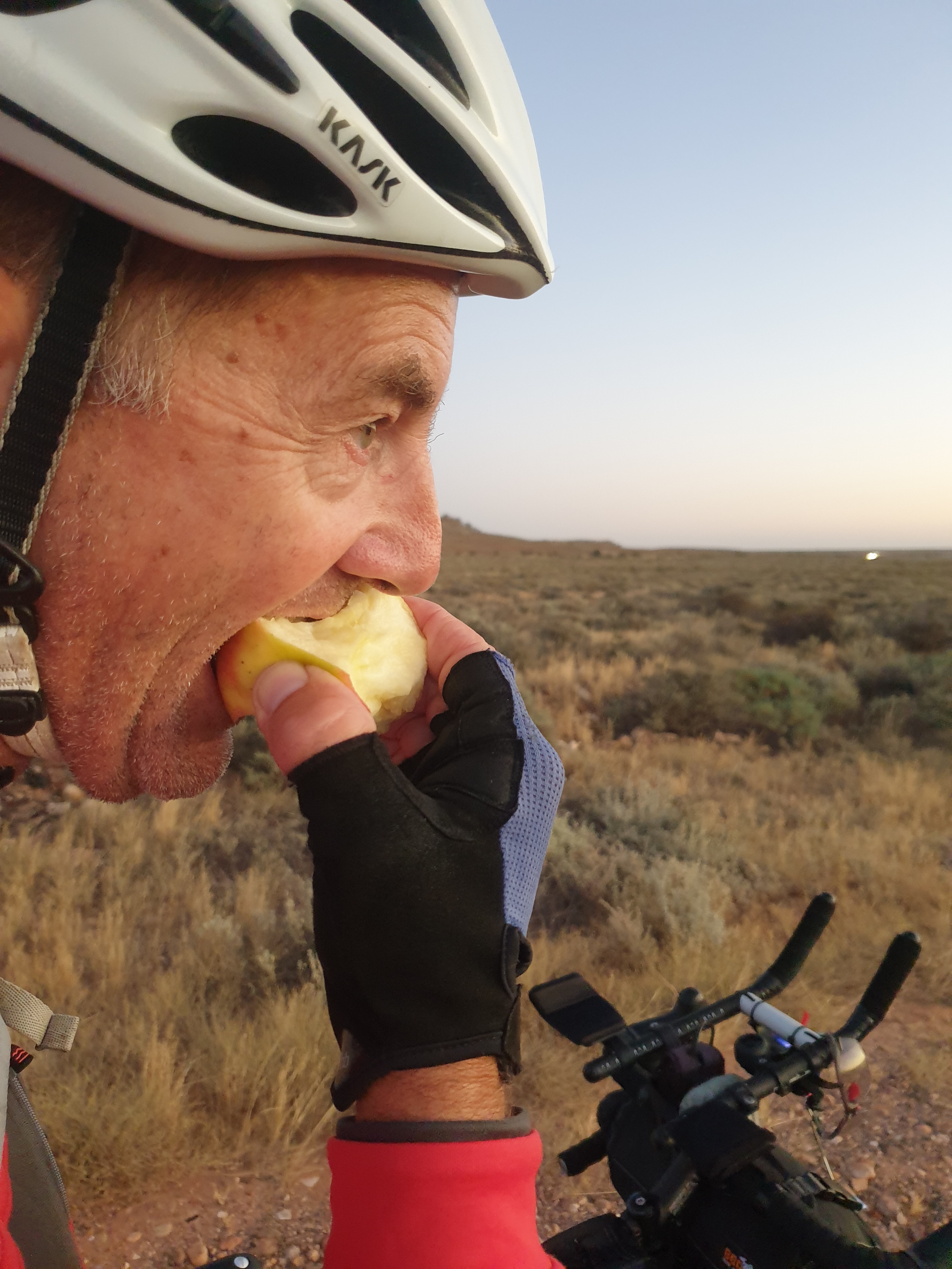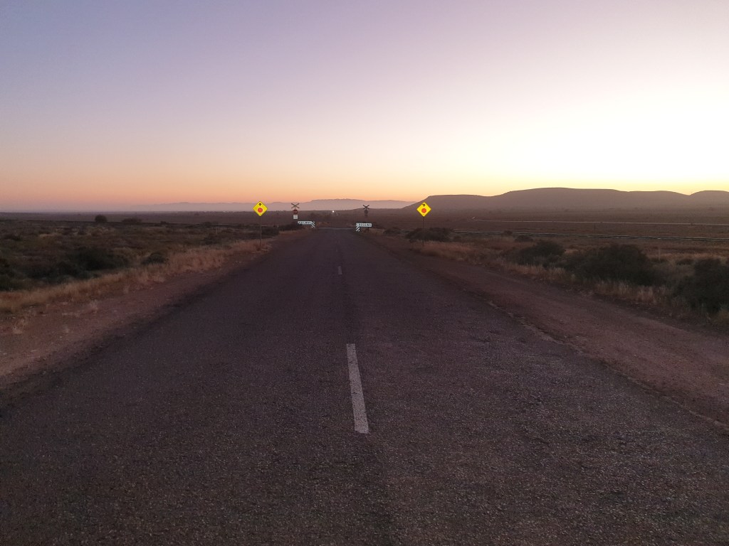 We were relieved to turn onto Caroona Rd – a 17k backroad into Port Augusta (following the IPWR route), and we stopped for a snack just before a level crossing. (Shout-out to Sylvia and Bob for the apples!) Just about sunrise.