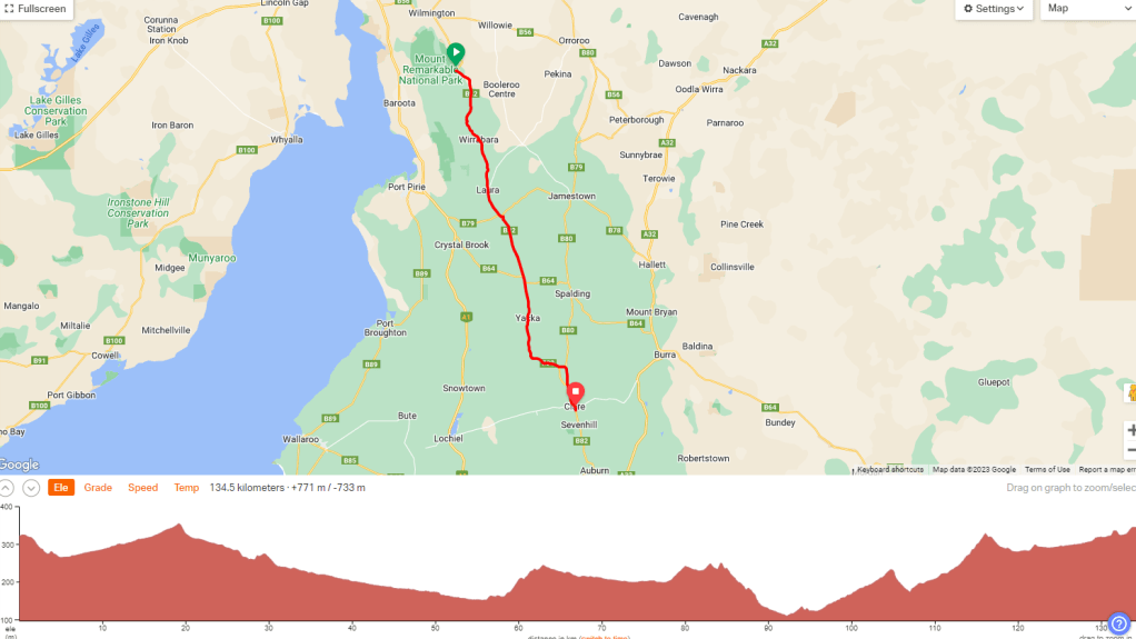 We got going at 6:40 am. Only about 100k today – or so we thought. Before Indipac I had done up a comprehensive spreadsheet breaking down the distances between cities/towns etc. The whole route. It had served us well so far. We experimented with tallying up daily distances as we strategised and then confirmed overnight stops. I now can’t remember exactly when it was that we realised that the distance between Yacka and Clare was actually 40km and not the 14 entered in the spreadsheet. I think it slowly started dawning on us along the way when the distances on the signposts showing Clare just didn’t tally up. At first you think, oh, maybe it’s because we’re not necessarily taking the most direct route. Then finally it dawns on you that it just cannot possibly be that much discrepancy.