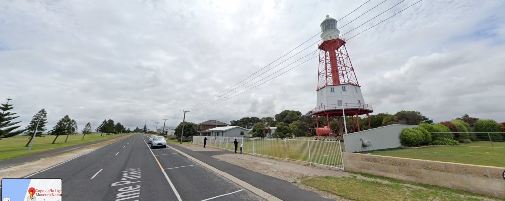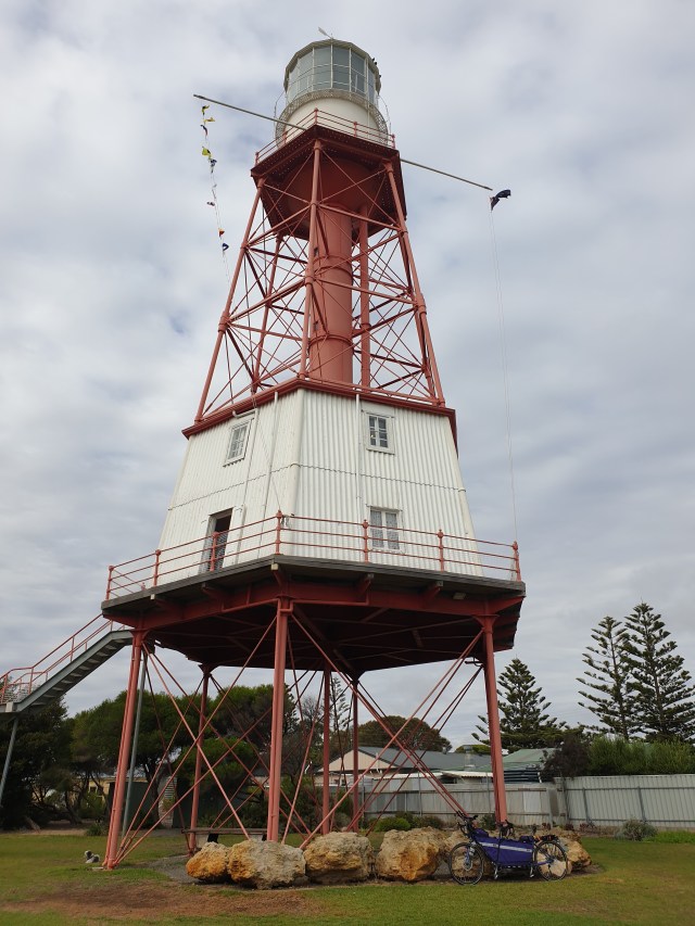 After breakfast/brunch we checked out the relocated Cape Jaffa Lighthouse, which is a decommissioned lighthouse that has been relocated to a large house block along the waterfront. (Well, the ‘reserve-front’ with the water just beyond it.) A National Trust guide up in the lighthouse called out to offer us a tour, but we passed on paying $15 each for a 45-minute tour while leaving our bike unattended down below.
