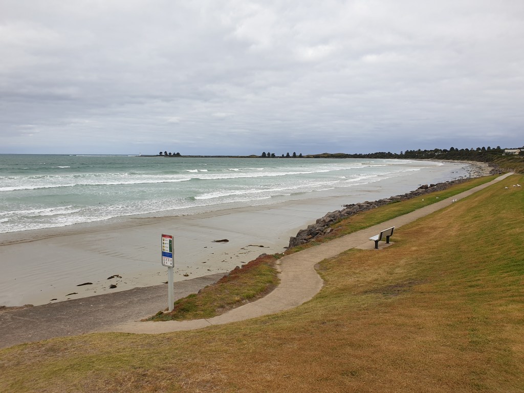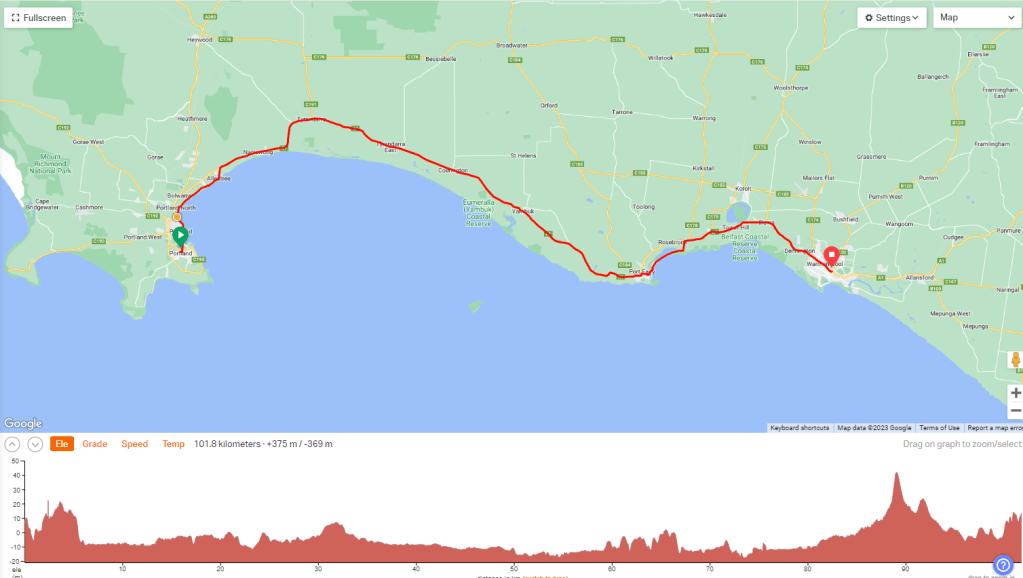 Marc notes: The last section to Warrnambool was really quite busy. The road shoulder was good enough though … pretty much the whole way. The gloomy weather and a stiff, cold headwind all day meant we were glad it was over when we arrived at Warrnambool.