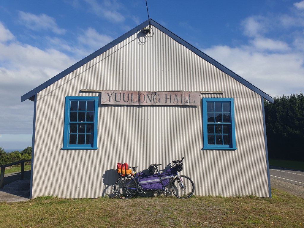 There was a bit of a 6k warm-up climb (before losing most of those metres gained), and then the last 18km of climbing. It wasn’t too bad – just a bit of a slog. A quick break at Yuulong, which deserved a photo because we have a Ulong near home that doesn’t need the extra letters to (presumably) sound the same! Plus country community halls are interesting.