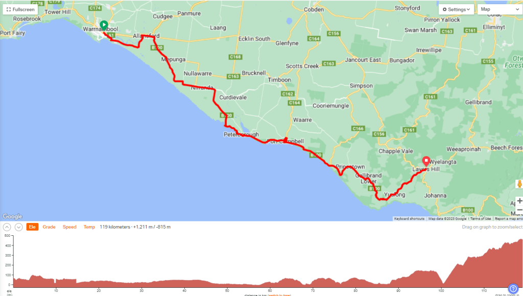 Because it was school holidays we’d booked ahead for tomorrow as well. Destination: Aireys Inlet, with a similar distance and metres to climb as today.