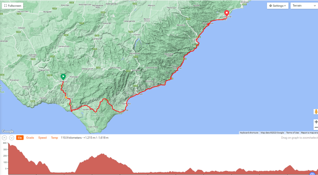 …before having to go up and over a big lump of a hill that sort of goes over the top of Cape Otway and through one section of Great Otway National Park. (The side trip out to Cape Otway Lightstation and lookout looks like it would be cool if you weren’t on a mission, and felt like riding 12k each way with some climbing to get back. ) We stuck to the Great Ocean Road because we were on a mission, and the 10k of climbing was more than enough!