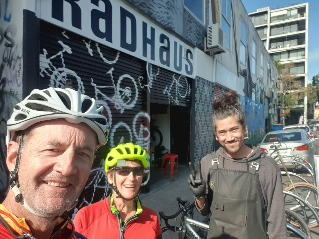 Just as I realised we’d overshot the cafe, we heard a voice call out. Something like “Have a great ride TwoUp”. What the heck? We circled around to chat with whoever it was! It was a guy, Benny, who owned Radhaus, a laneway bicycle repair business that just happened to be in the same building as Acústico, the cafe I was aiming for.