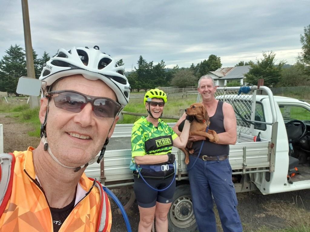 We merged onto a busier road, so it wasn’t the greatest riding, but at least it was pretty flat. We had just ridden through Tyers and were passed by a ute that then pulled into a farm driveway. The driver didn’t open the gate though – he got out and stood there, ready to wave. Dotwatcher? We pulled up, and yes. It was Brett, with Barclay (Barkly?), who had tracked us and driven out to cheer us on. Brett was great, and doggie pats always boost your spirits.