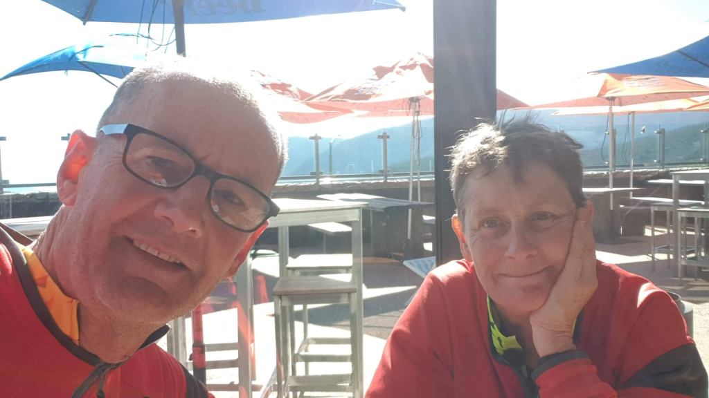 We had burgers and chips for lunch. And I had coffee. Boy did I need coffee. We’d been there nearly an hour, perhaps, when Marc nudged me and gestured in the direction of a young couple moving away from the counter with coffees in hand, him nudging her. Oh. My. God! We knew them! It was Emily and Jake – the daughter, and, as it turned out, newly-minted son-in-law – of long-time friends of ours. We’ve known Emily since she was born, but we’ve shared canyoning adventures with both of them in more recent years. They were actually on their honeymoon. While they had an idea we might be riding through this area, we had no clue about them. They are into hiking, and would often be camping, but because it was their honeymoon they were living it up in an Airbnb in Bright, and going for day trips and shorter walks.