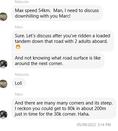 We headed off from Falls just after 2.00. It was pretty much all downhill to Mount Beauty – for 30km – and you would think that that would be all yeeha! Nope. It was actually pretty hard on a tandem, and really tough on Marc’s hands. Later Marc had this message exchange with Malcolm (who has been riding single bikes now for far too long – and only rode his tandem, unloaded, with a kid!!)