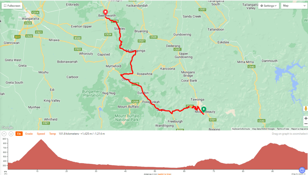 We had 5k to Porepunkah, a right there at the roundabout (well, otherwise we would have ended up at Mt Buffalo!) … and then about 20km before turning right (5k short of Myrtleford) and doing this great big circuitous route that misses Myrtleford, and goes up through Stanley instead, then back down to Beechworth.