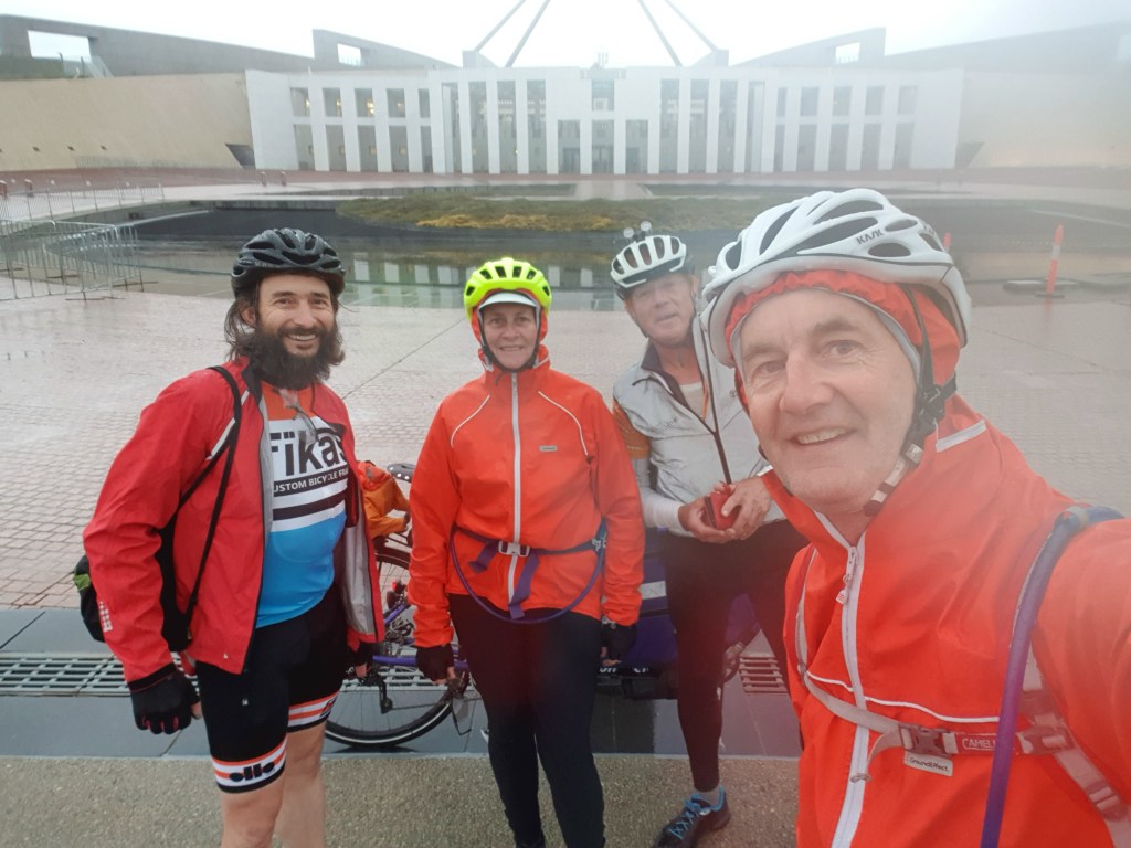He navigated us back onto the route. Thankfully I didn’t have to try to navigate in the rain. The route left the bike paths and ran on a shoulder bike lane on the dual carriageway main road. Then off again, and zig-zagging through back streets to Parliament House. At some point Michael James (of the lovely comment when we made Three Mile Dam) joined us.