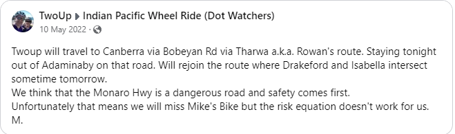 It’s a pretty significant route deviation, made more difficult by the fact that we would miss the memorial to Mike Hall on the Monaro Hwy where he was tragically killed in 2017. It’s a tradition for riders to stop and pay their respects, so it felt bad not to do that. On the other hand, I don’t want there to be any more IPWR memorials – and I absolutely don’t want it to be ours. Being able to avoid the Monaro was the deal breaker for me on even agreeing to do Indipac. When Rowan – a Canberra local – last year announced that he would be taking Bobeyan Rd for safety reasons, then that settled it. If a local (and hardcore) cyclist entering Indipac was electing not to ride the Monaro for safety reasons then that was more than good enough for me. Yes, the recurrent theme through this write-up of our Indipac experience is that I have some HUGE issues with parts of the route. Because it is no longer ‘official’, no one will ever take responsibility for changing the official route, so it comes down to the individual to make the decisions for themselves. I know there will be some that will always be purists about it.