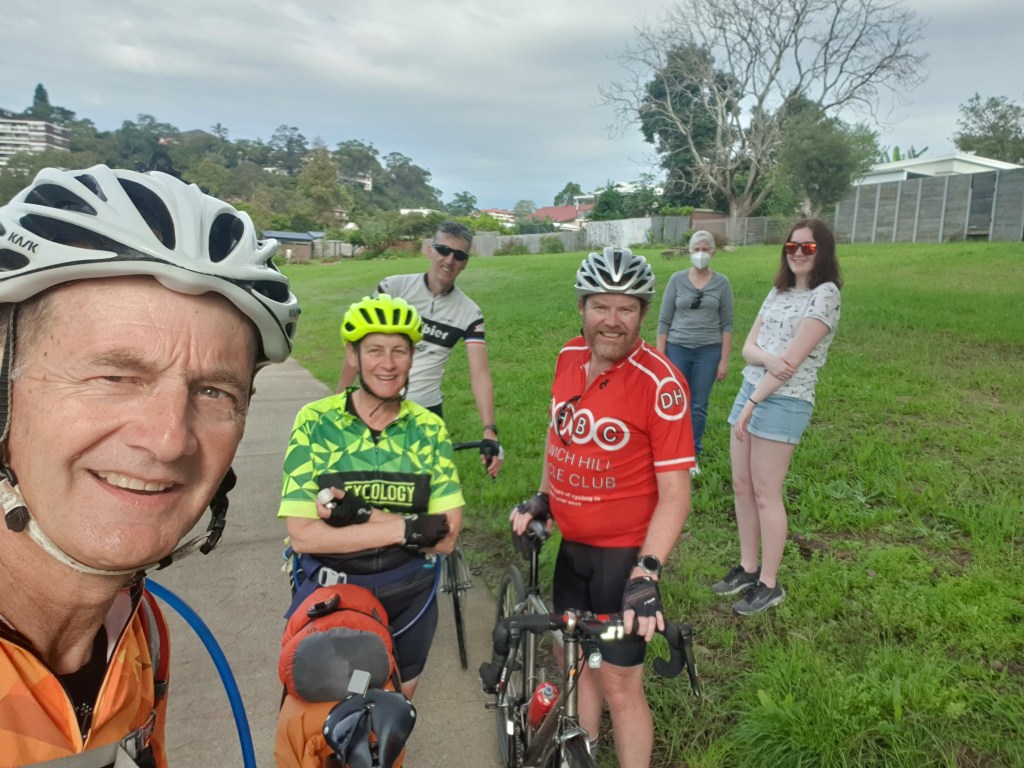 We pulled up at the cafe that was very handily located, on the route, only 2 km along. Hugs all round and a lot to talk about over coffee and food. They suggested morning tea at Rhodes – about 40km on. Sounded good to us! Today was all about enjoying the final ride in, and not finishing off – and spending time with family – feeling totally shattered.