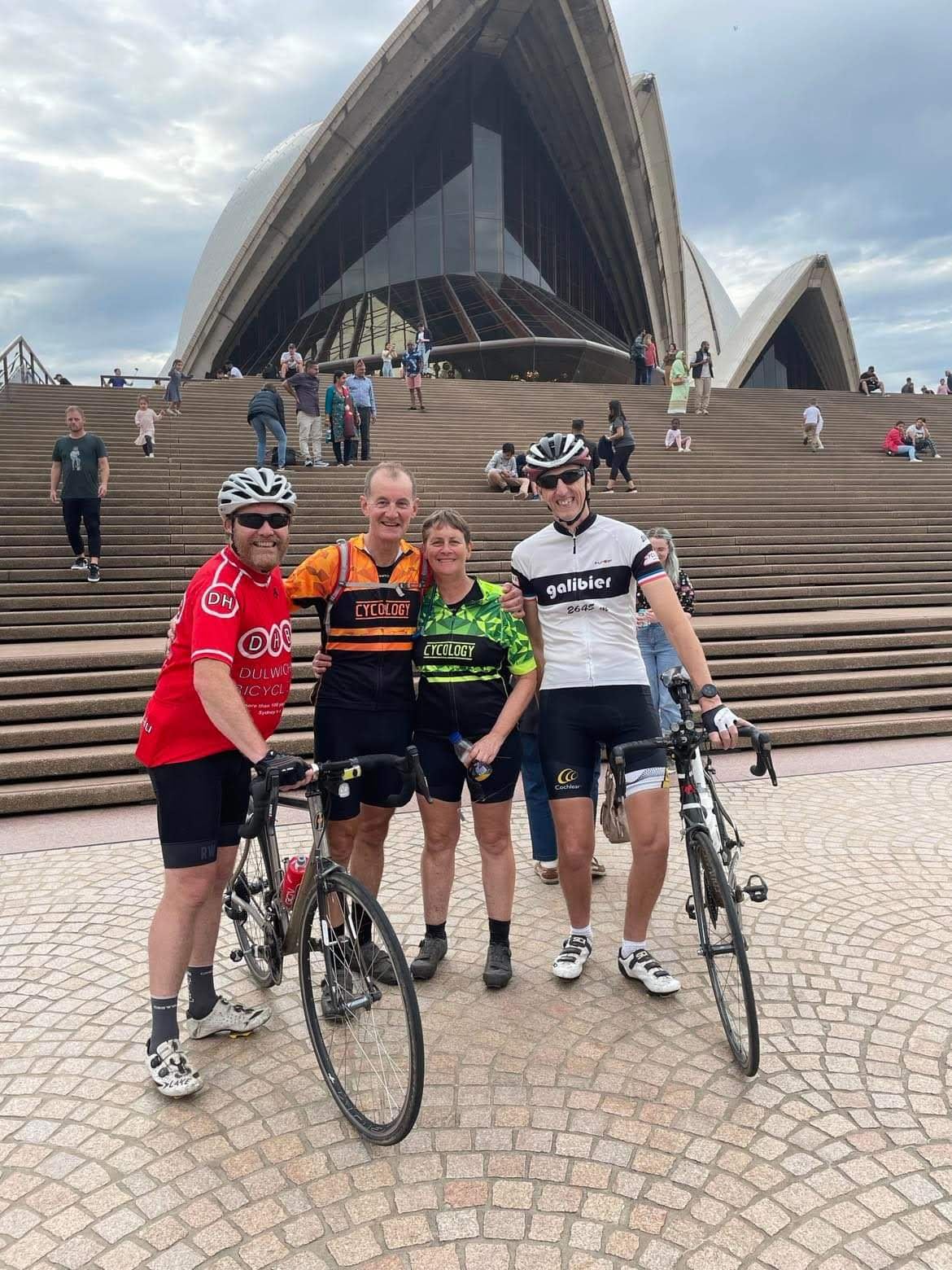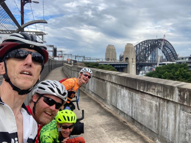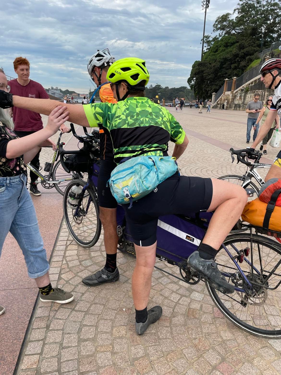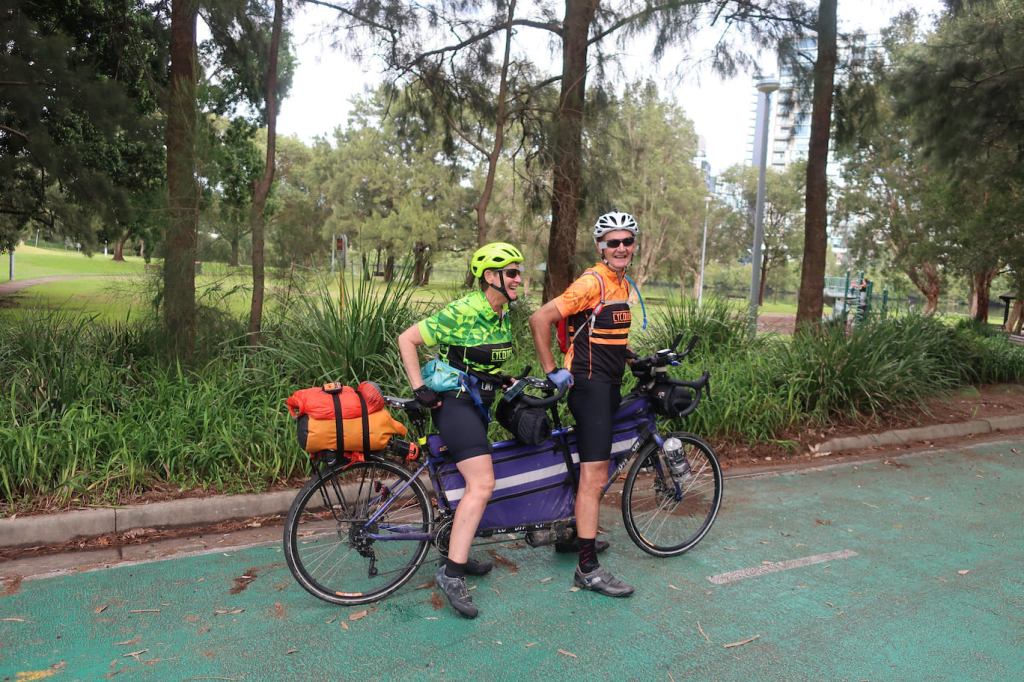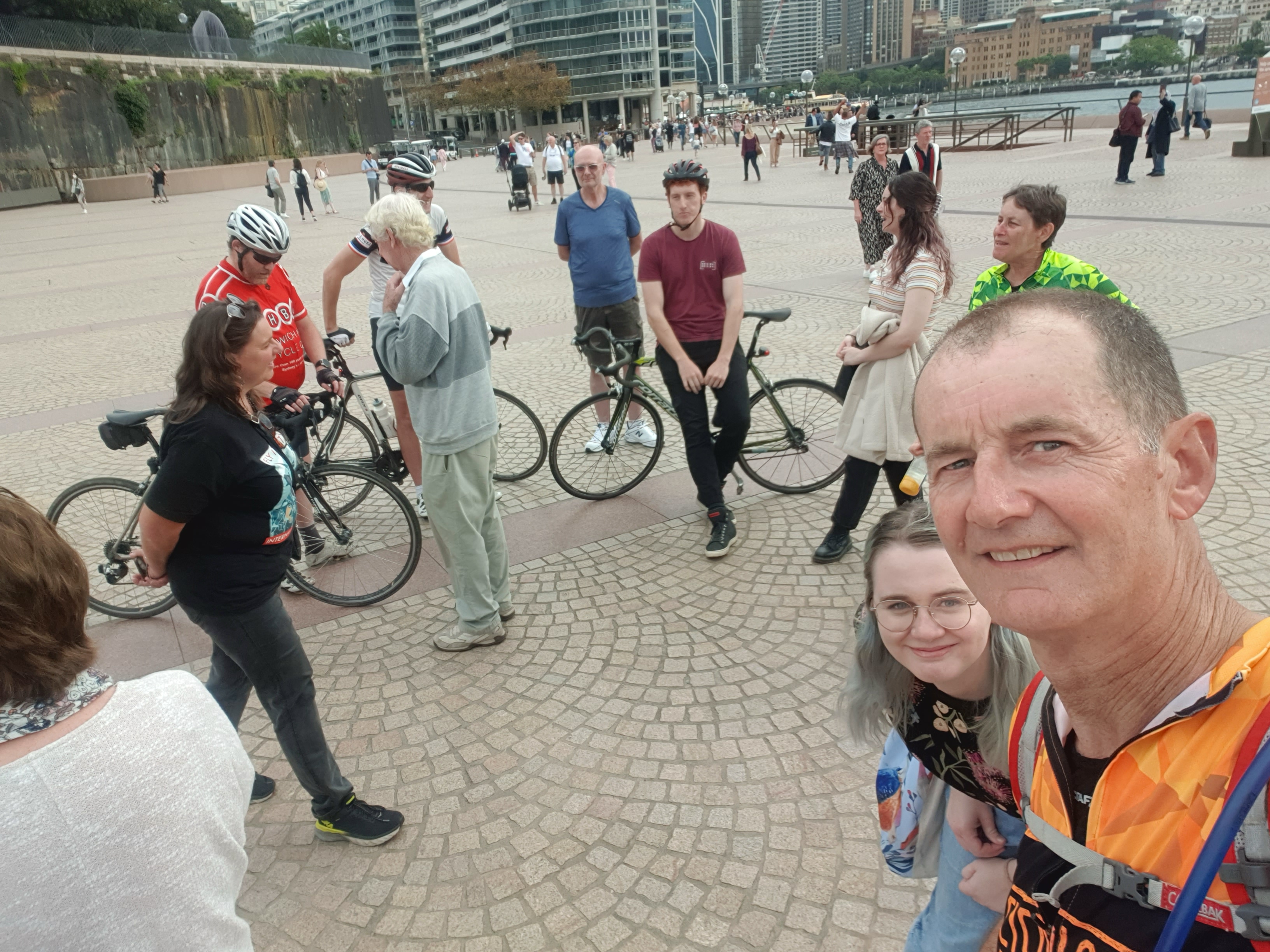 With the tandem too heavy and cumbersome to risk the traditional front-wheel dip into the harbour off the stairs, we loitered around the Opera House forecourt for a while but eventually said our thank yous and goodbyes to everyone. We couldn’t thank Malcolm and Roger enough for having spent their whole day with us, and taking the stress out of the navigation. We are very lucky to have dot-watching, cycling friends share our last day! Malcolm messaged us later to tell us he got lost going home! Just as well he saved all the navigation for us!